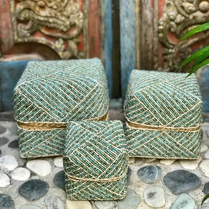 Handmade Bamboo Offering Boxes from Eastern Bali Embellished with Glass Beads. Great for storage in the bedroom, bathroom or office.
