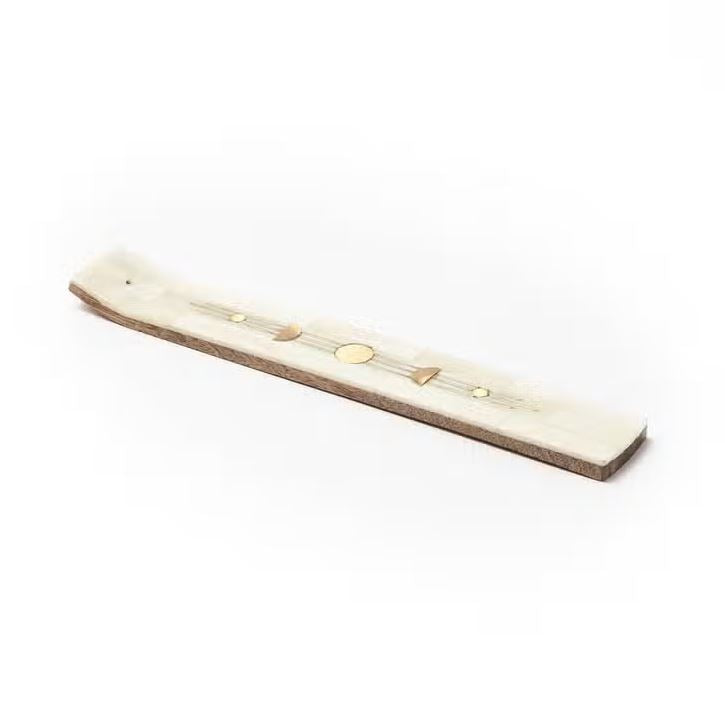 The art of traditional Indian wood craft requires mastery, passed on through generations, to create intricately hand carved treasures from solid blocks of mango wood. Master artisans intricately hand carve bone elements to span the base of the incense holder. Brass elements are expertly handcrafted and inlaid in this intricate lunar moon phase design for a refined, eye-catching result.