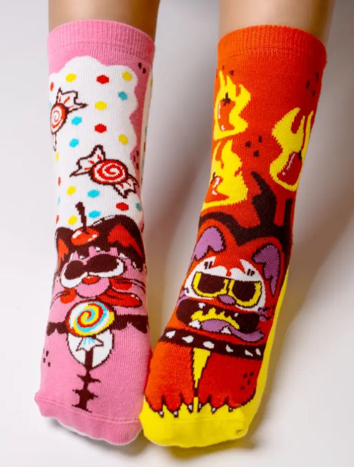 These maximalist cat socks are 1 of 3 purrfectly mismatched pairs from our limited edition Gabbercats Collection, designed by artist Gabby Kash (aka @pinkgabbercat). An excellent fit for young, wacky and colorful cat lovers who believe in a friendlier, more colorful world!