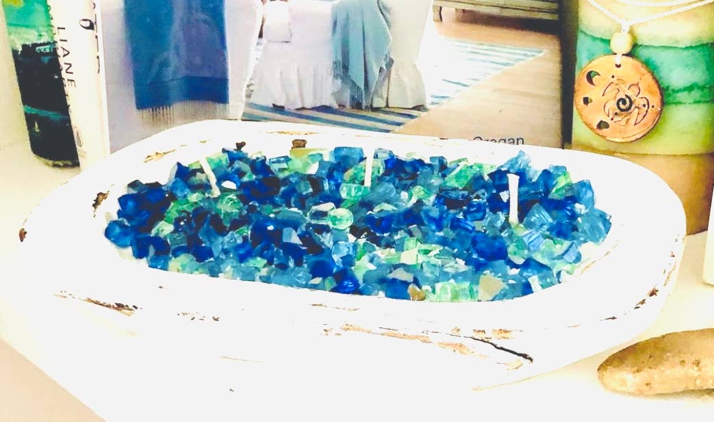 100% American grown soy wax infused with our clean, natural "At the Lake" (Cool water scent) fragrance oil, then hand poured into white antique finished wood dough bowl with 3 lead free cotton wicks and accented with blue multi-colored tempered fire pit glass to make your own mini personal fire pit. No artificial chemicals, dyes or additives used.