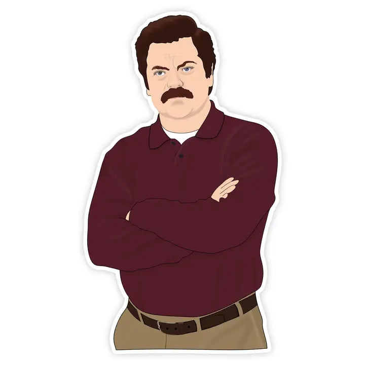 Ron Swanson Sticker Size: 2.8" x 3.5" -Vinyl -Waterproof -Cut to shape -Thick -Durable -Peel and stick Great for notebooks, laptops, phone cases, binders, folders, walls, water bottles, yeti's, and pretty much anything else with a flat surface!