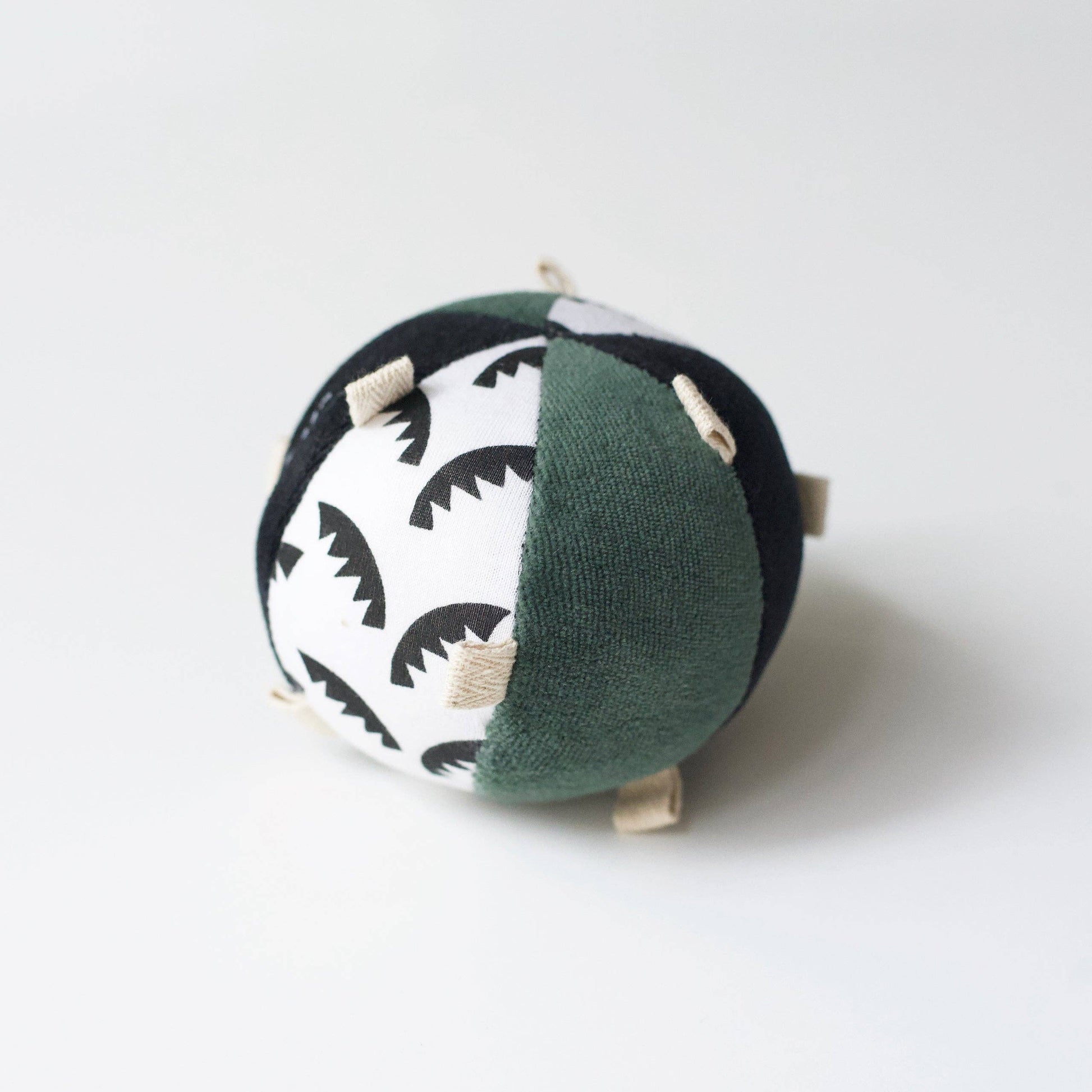Baby can explore the world through touch, sight, and sound with our classic Montessori-inspired Taggy Ball. This soft ball, made from a patchwork of organic fabrics, features an array of little tags perfect for tiny hands to grip, tug, and explore. The adorable high-contrast jungle leaf graphics from original hand-painted designs are made to captivate baby's visual attention, fostering early visual development and curiosity.