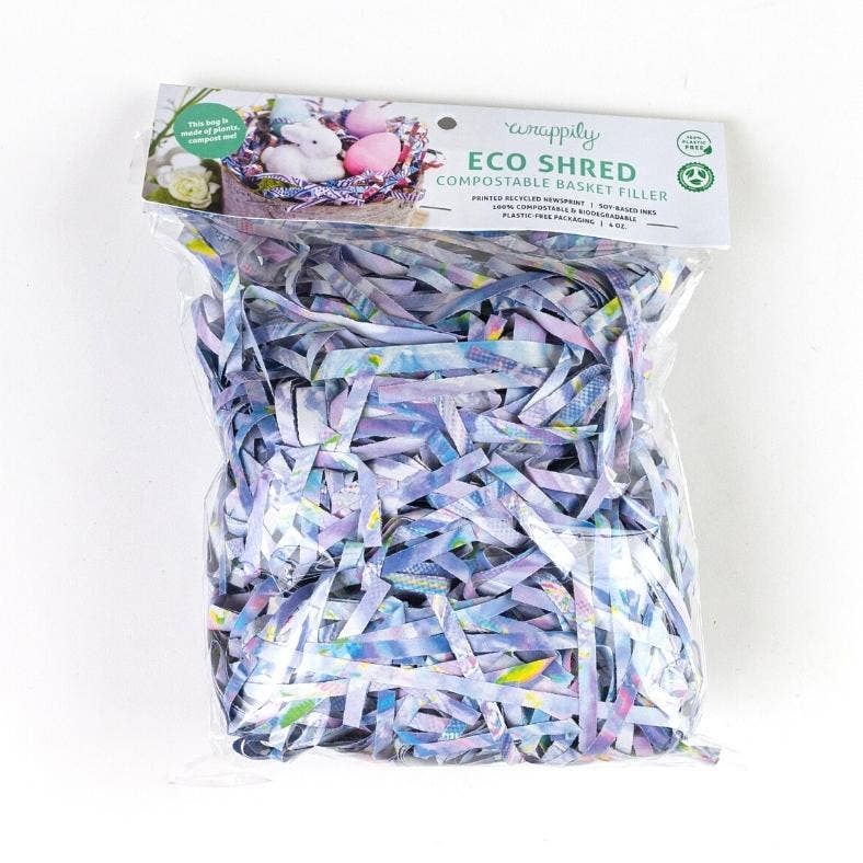 Printed, patterned newsprint makes for a fun and compostable basket filler—even the bag it is in is certified compostable PLA! This unique lofty fill is great for Easter baskets—and, eventually, the worm bin, too.)