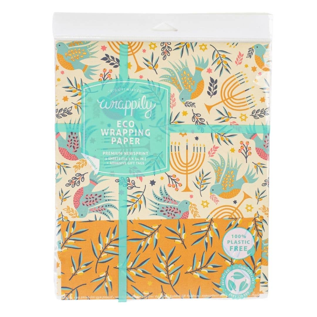 The shapes and colors of the Hanukkah all wrapped up and tied with a bow. Celebrate sustainably with our recycled and recyclable wrapping paper.
